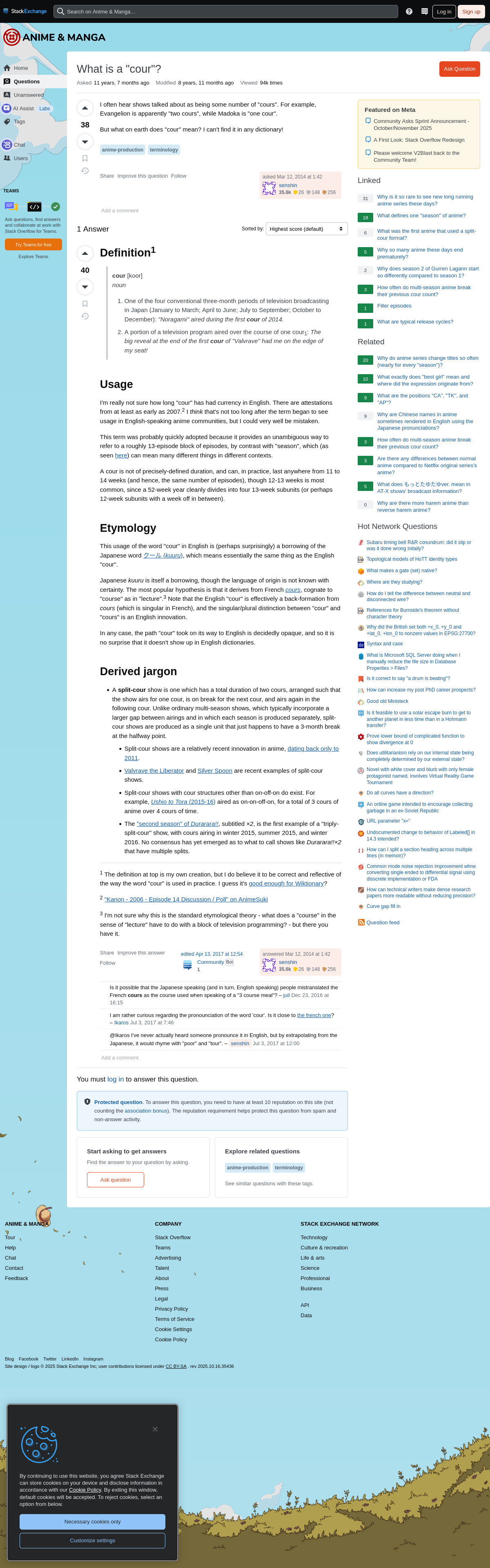 アニメやドラマ等TV番組の季節毎の編成を表す「クール」という言葉、アニメ文脈で2000年代に英語に逆輸入されて、courという綴りで使われているらしい↓。昔から語源は何なんだろうと思ってたんだが、LLMは「quarterに由来するんじゃない?」なんて言ってた。ホントか?