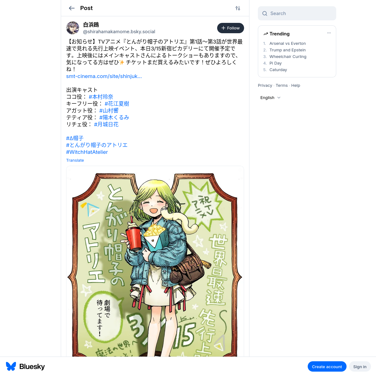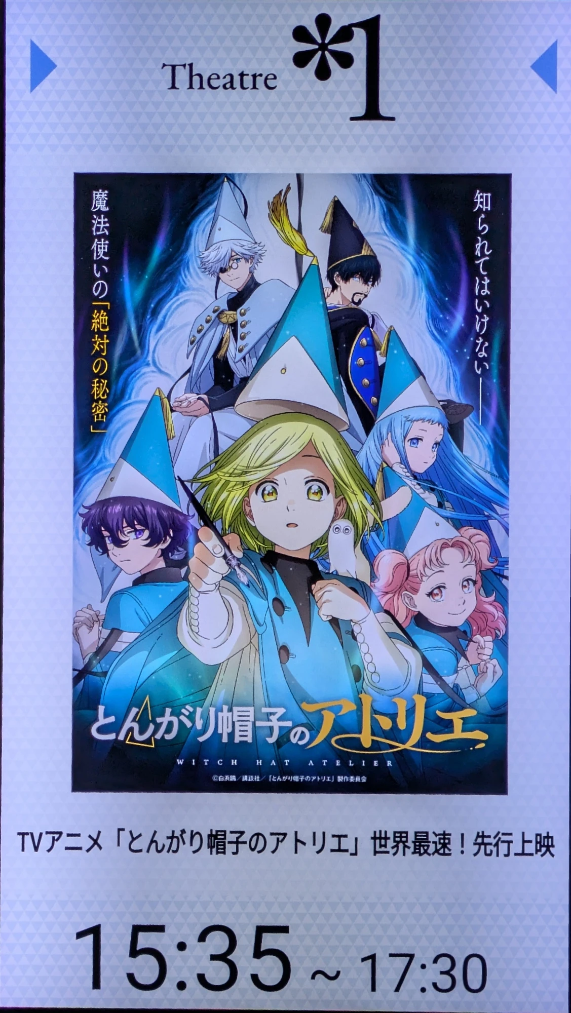 そんなわけで行ってきました「とんがり帽子のアトリエ」世界最速(といっても今日二度目の回だったので最速ではない)先行上映会。4月になればTV(BS11も最速なのはありがたい)や配信(NetflixとAbema)で見られるとはいえ、3話までを劇場の巨大スクリーン&音響で見られたのはとてもありがたかったです。劇場版、と言われても信じてしまうような素晴らしいアニメ化で、ある意味区切りよい3話まで、堪能しました。ちなみに海外向けのCrunchyrollでの先行配信は2話までとのことなので、ちょっとやきもきするかも、とあゆみさんは言っていましたw。 (23:16 bskyから・詳細)