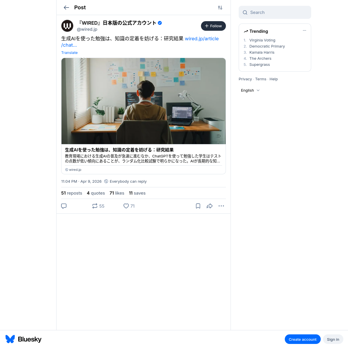 https://wired.jp/article/chatgpt-study-aid-impairs-long-term-knowledge-retention/ (10:35 bskyから・詳細)