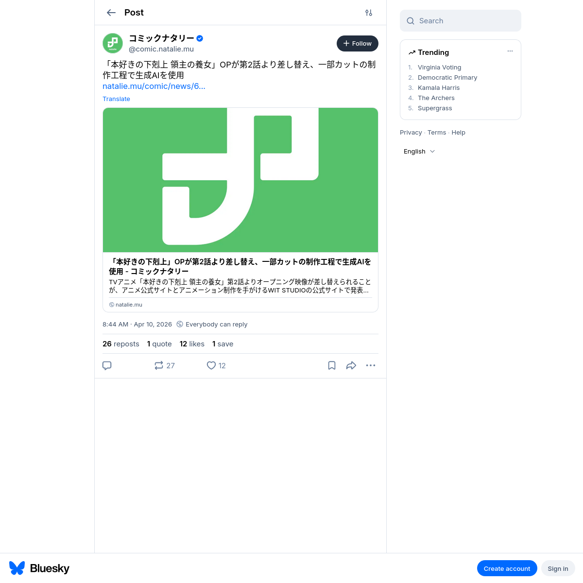 Twitter/Xの公式のリプライに連なる批判も見ていたけれど、本件発端も海外だし批判のコメントも英語が多く、世界的にも今の生成AIの権利侵害については問題と思っている人が多いことが分かる。まぁあれだけ訴訟や法規制に向けた議論が起きているのだから当然っちゃあ当然なんだが、むしろ日本の権利保持者はおとなしすぎるくらいだよな。応援したい。 RT https://bsky.app/profile/comic.natalie.mu/post/3mj4wll3dev2y (20:52 bskyから・詳細)